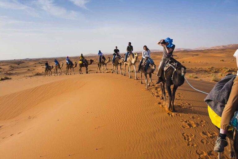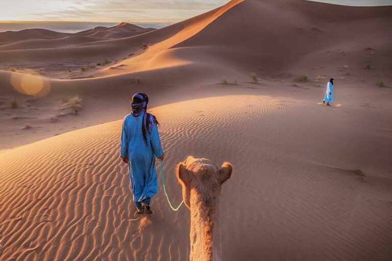 Travel through the palm oases of Skoura and the winding Dades Valley, marvel at the Todgha Gorge, and embark on a camel trek into the golden dunes of Merzouga. Spend a night in a traditional Berber desert camp, enjoying authentic Moroccan cuisine, live music, and a sky filled with stars. On the return journey, cross the Draa Valley and the Anti-Atlas Mountains, passing kasbahs, oases, and landscapes that capture Morocco’s timeless desert beauty.