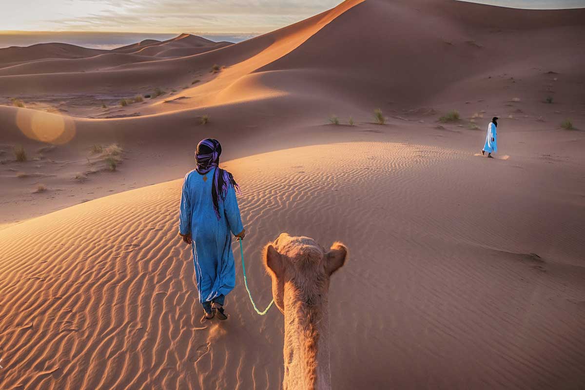 Camel trek at sunset in the golden Erg Chebbi dunes