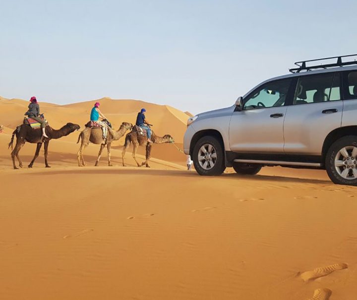 Wake early for a magical sunrise over the dunes, then ride your camel or 4×4 back to Merzouga village.