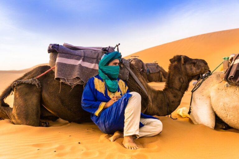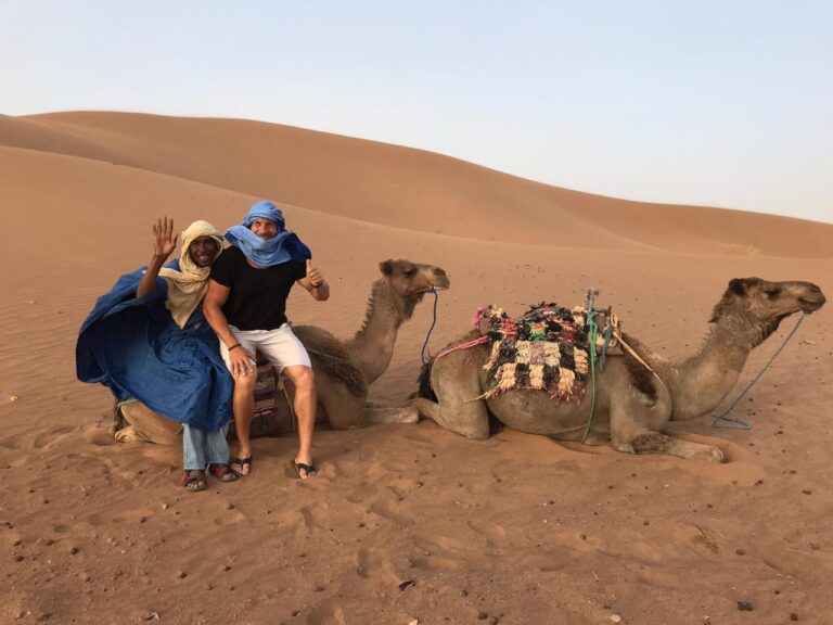 Journey through the lush Skoura Oasis, the stunning Dades Valley, and the towering Todgha Gorge before reaching the golden sands of Merzouga. Enjoy a camel trek at sunset and spend a night under the stars in a traditional Berber desert camp. Continue your adventure with visits to desert nomads, fossil-rich oases, and the Gnawa village of Khamlia, before traveling through Erfoud, Midelt, Azrou’s cedar forests, and Ifrane, the “Switzerland of Morocco,” finally arriving in Fes with unforgettable memories.